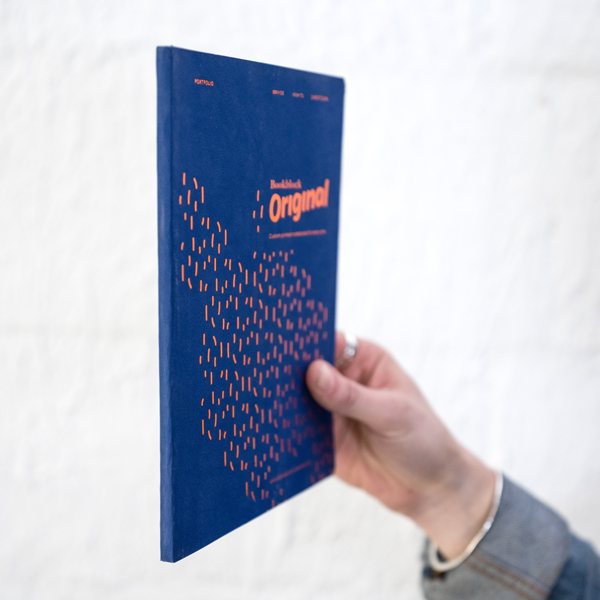A slim perfect bound notebook with a false cover, comprised of material that tightly encloses the 96 sewn pages inside. You can choose between ivory ruled, plain and dot grid 80 GSM paper.