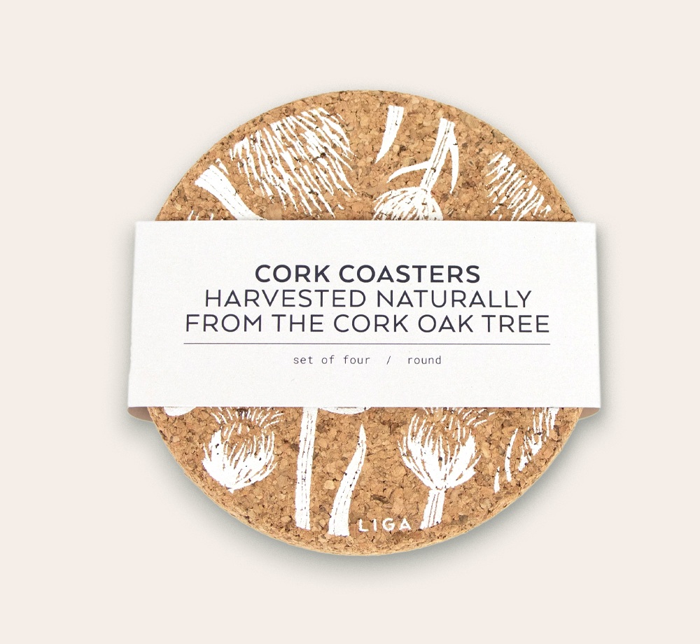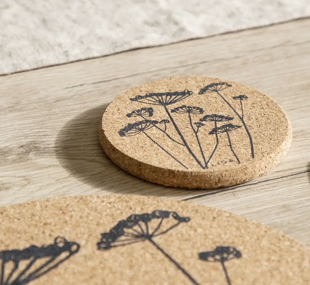 Liga's cork coasters make a lovely finishing touch to a sustainable gift set. Whether you're creating an onboarding gift for staff or a promotional teaware gift for your brand, these coasters are great to have at home or on the desk. The cork is harvested naturally from Portuguese cork forests without harming the trees, and continues to absorb CO2 even as this product. They are finished with a natural design that's hand printed in Cornwall. Enquire about the range of available designs to find one that suits your project. Single colour custom print is available on orders 150+.