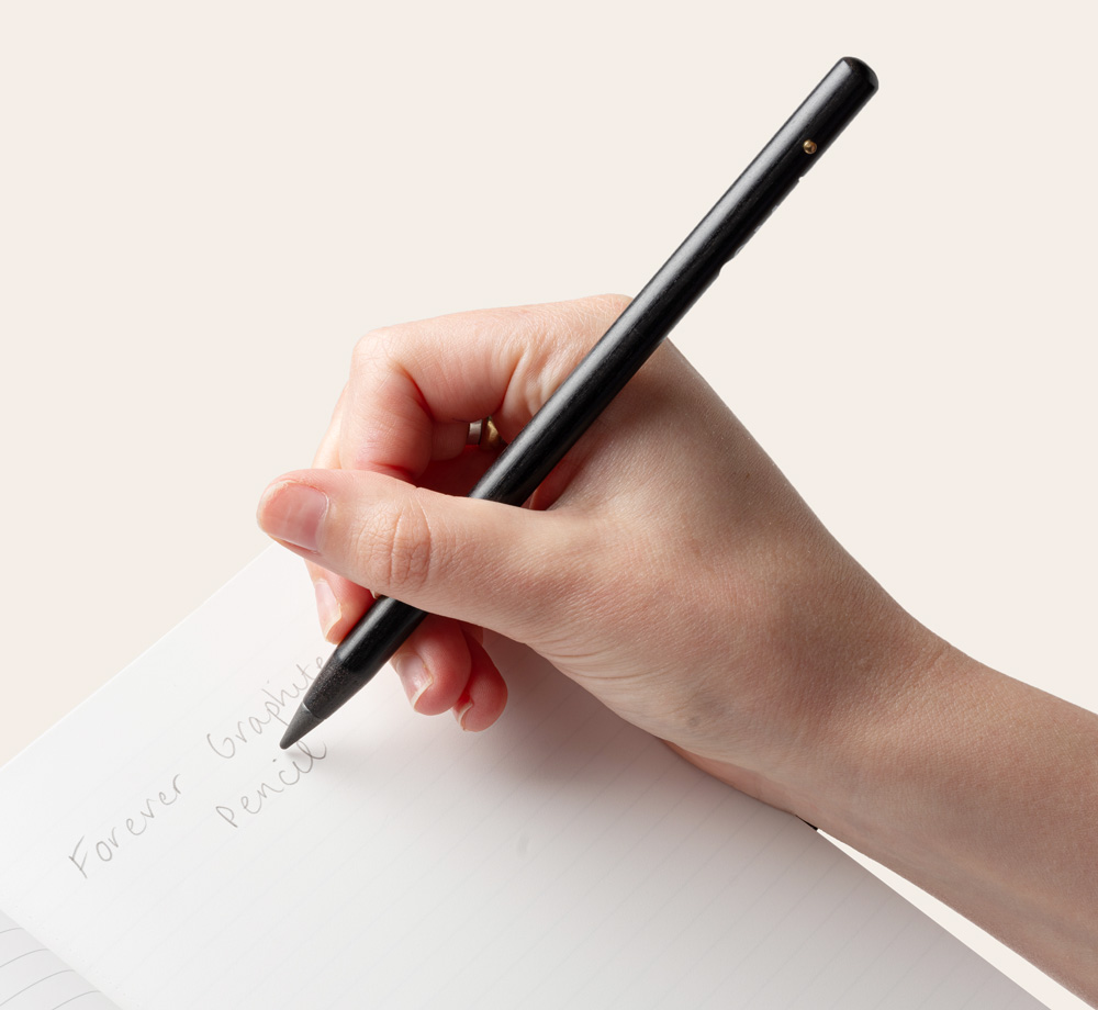 Recycled wood, graphite tip - The Forever Graphite Pencil is a durable and long-lasting writing tool. The graphite lead is smooth and produces a dark, crisp line with the ability to write up to 30,000m, lasting a significant amount of time. The pencil is made with recycled wood, including pine, black sandwood, and oak, which makes it an eco-friendly choice.