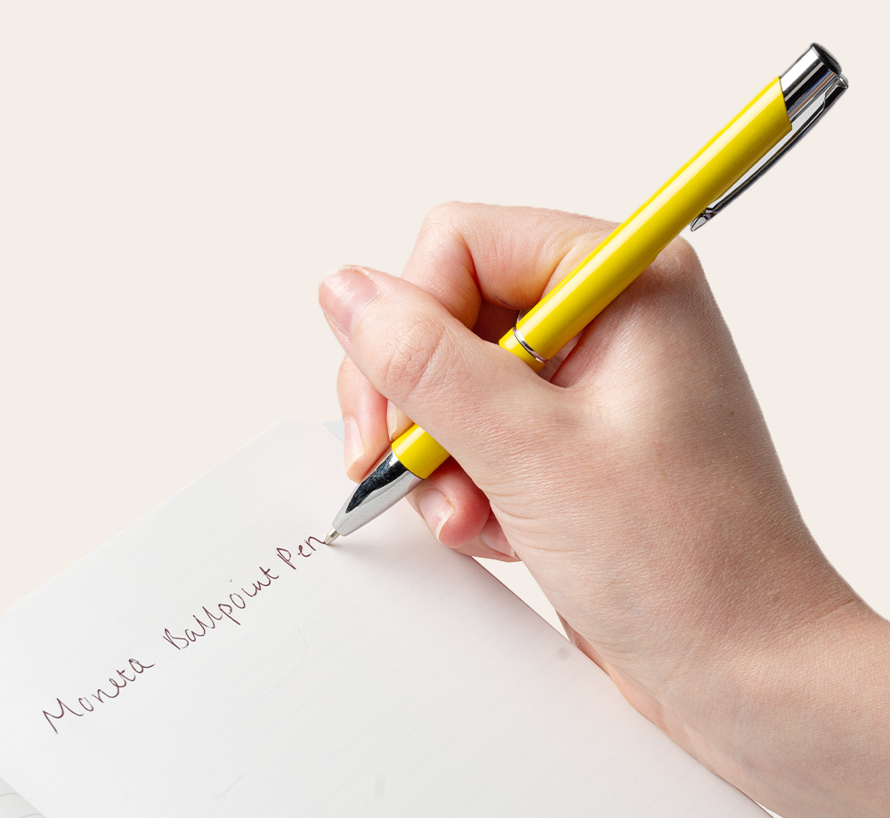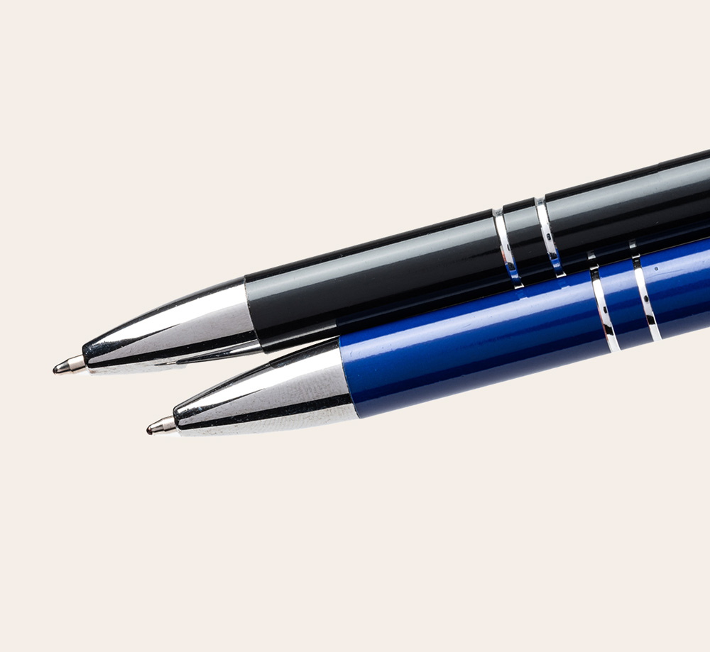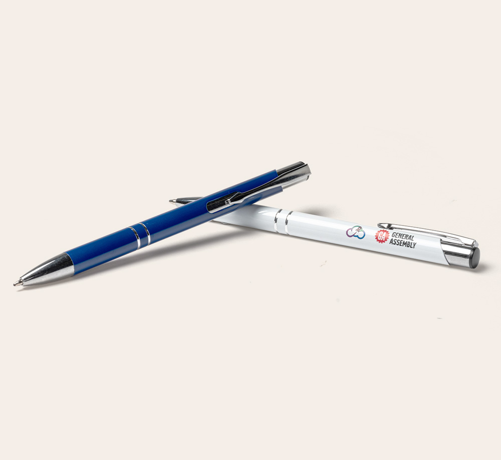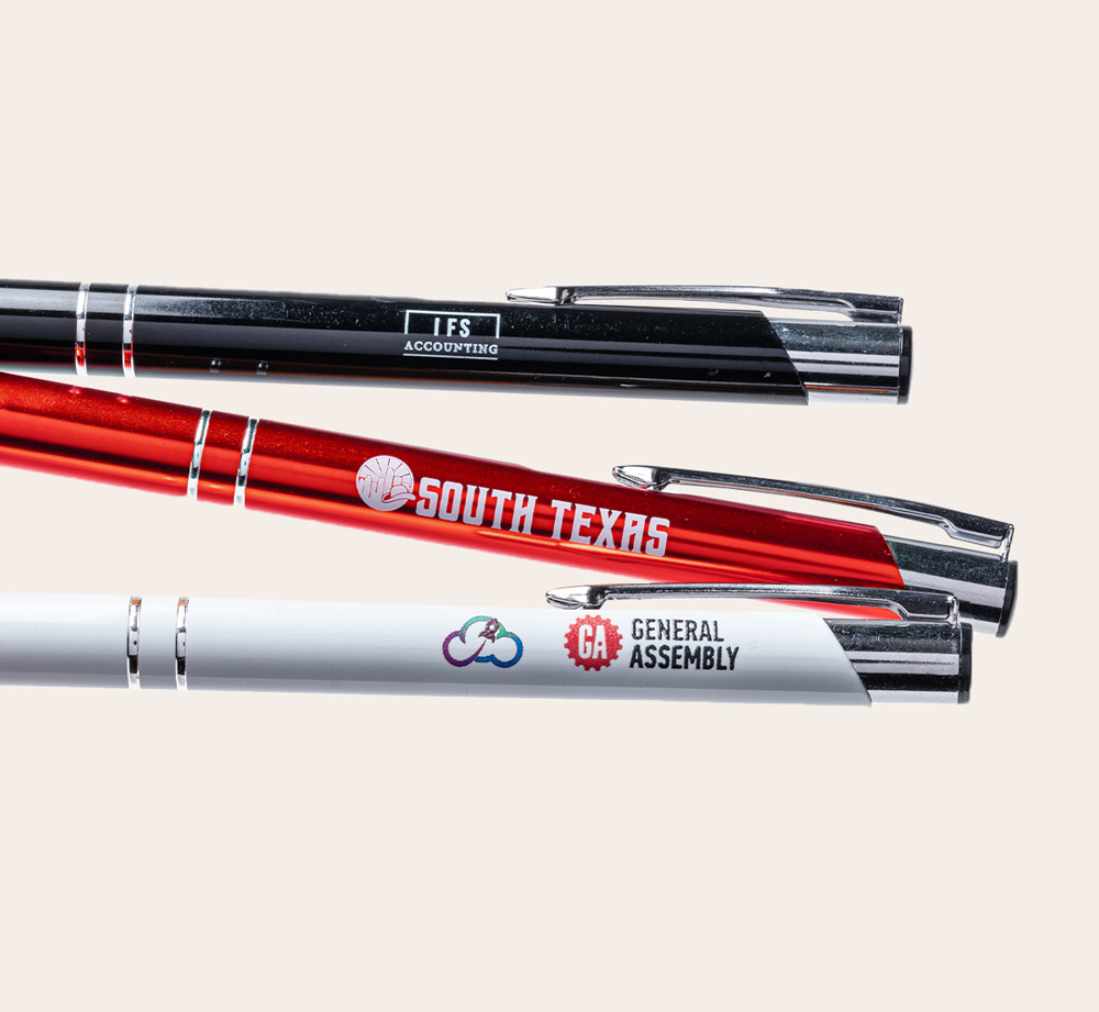 Your logo is transferred onto the pen in a single coloured ink from an engraved plate using a silicone pad. It’s a fast and versatile method suited to many different surfaces and shapes, making it ideal for pens.