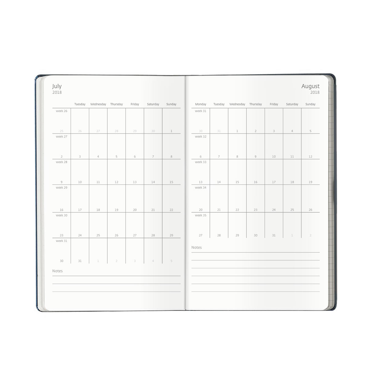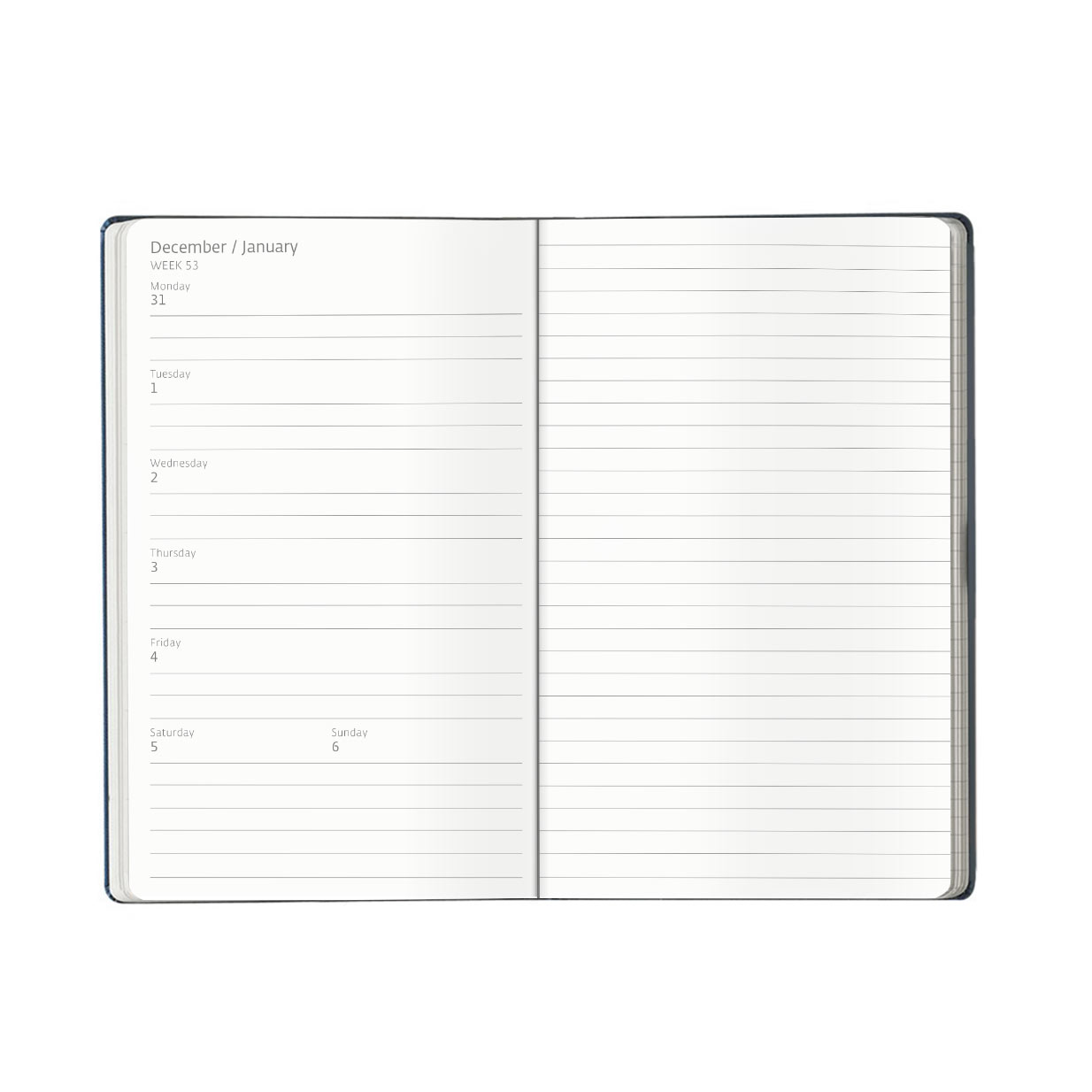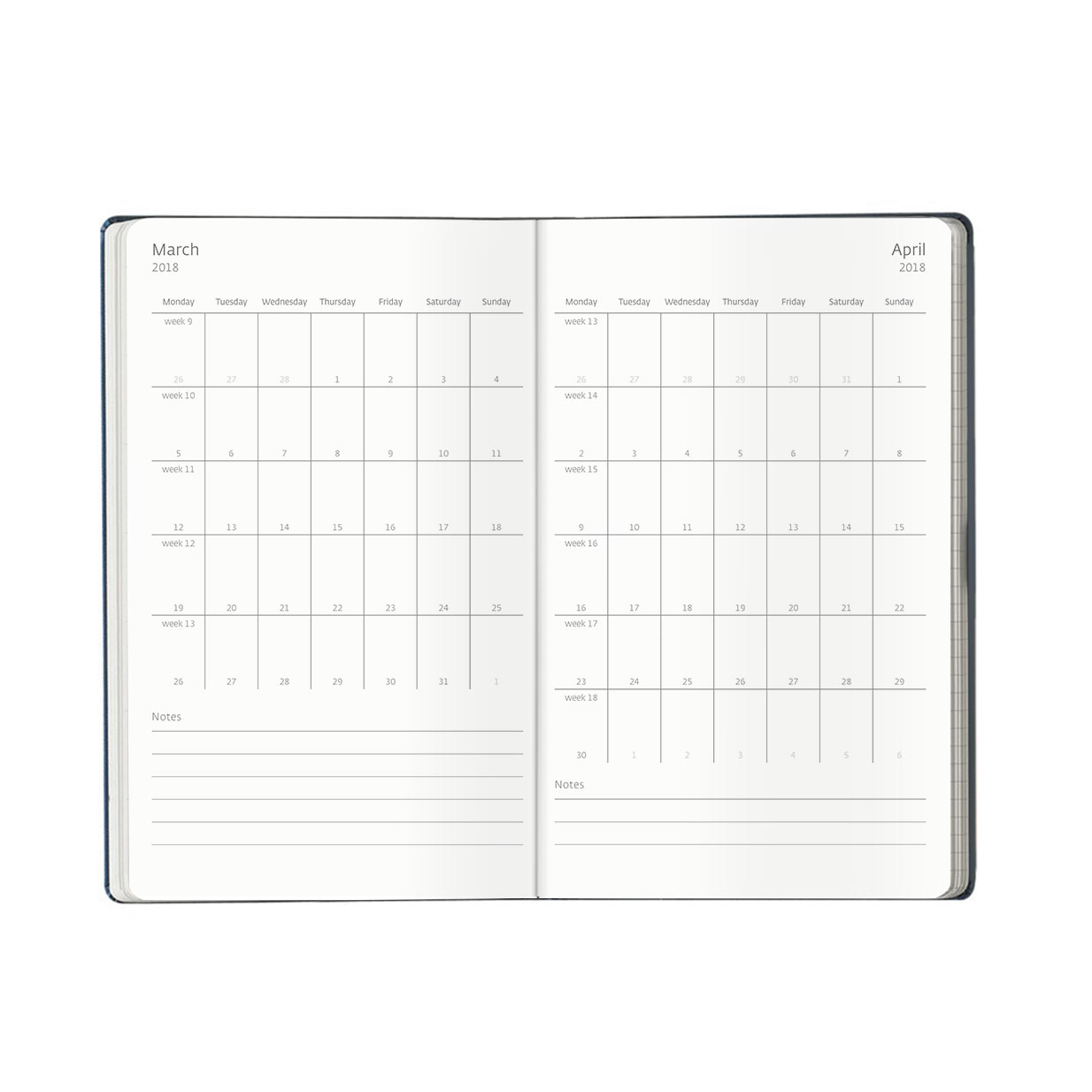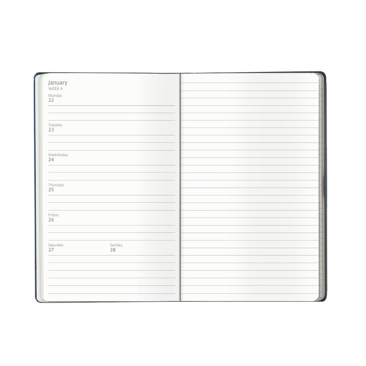 The cover is soft touch, available in a range of colours with a coordinating coloured closure band and a discreet blind embossed date feature. The diary features beautiful ivory coloured pages with grey print in a simple and chic week to view dated format with an accompanying ruled notes page for additional or expanded notations.